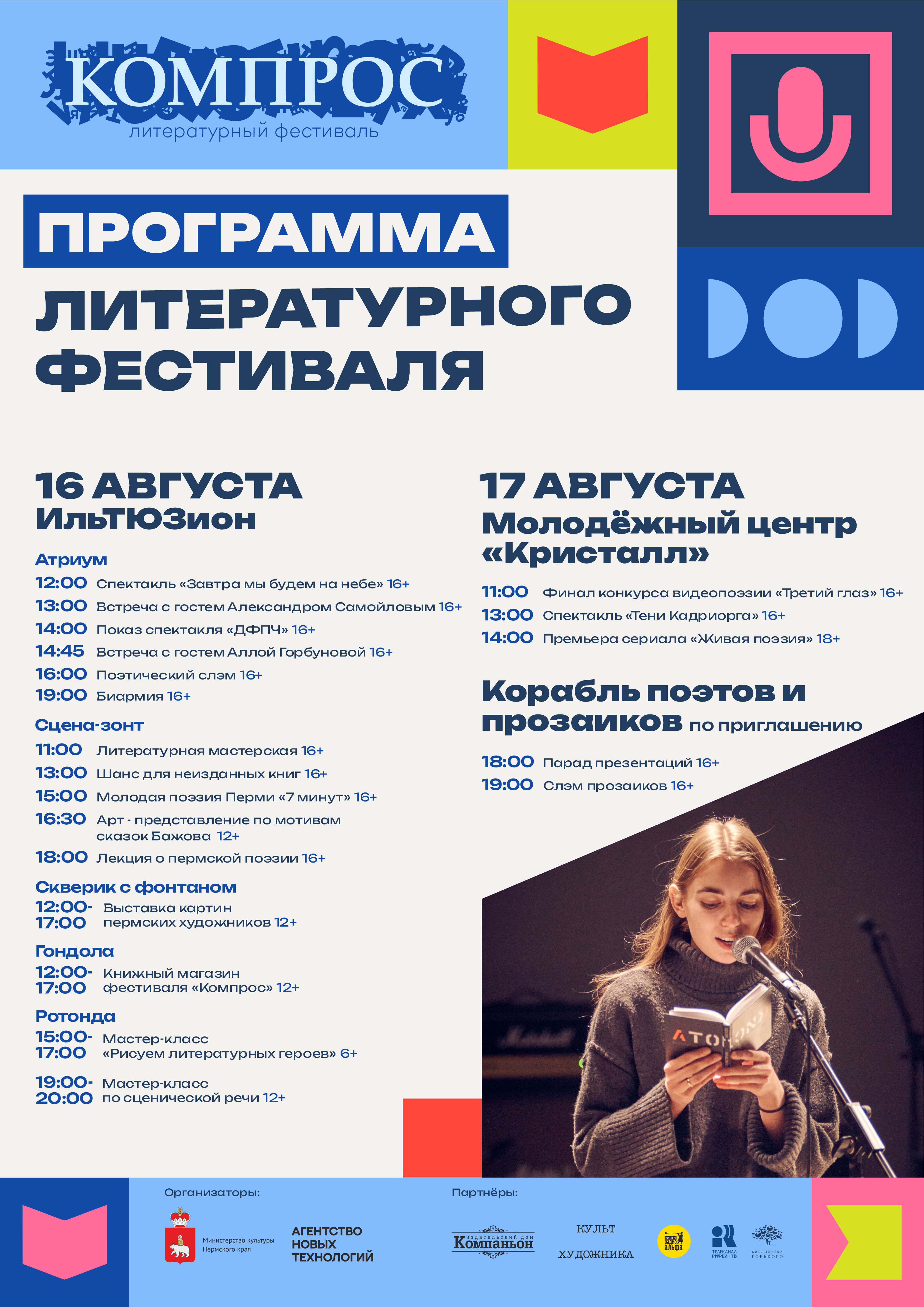 Литературный фестиваль «Компрос» пройдет в Перми с 16 по 17 августа при поддержке Министерства культуры Пермского края. Организатор — Агентство новых технологий.